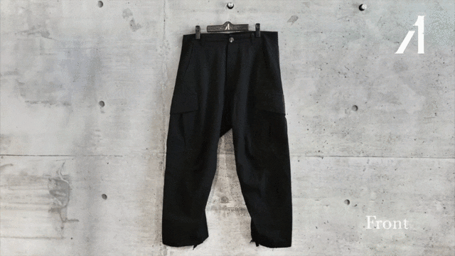 3Ⅾ設計でゆとりがあるため、裾幅はややワイドで、股上は深く、全体的にラフに着こなすことができます。また、ややクロップド丈となっており、ドローコードで裾を絞ることも可能です。フォーマルにもインフォーマルにもご着用頂けます。 -
