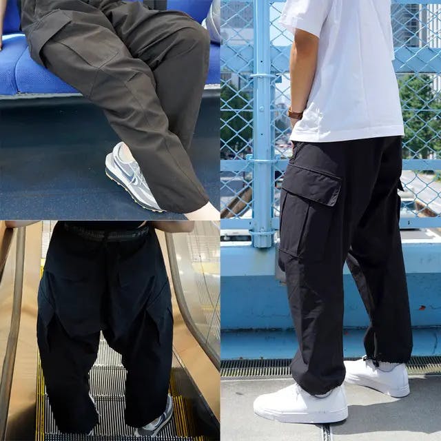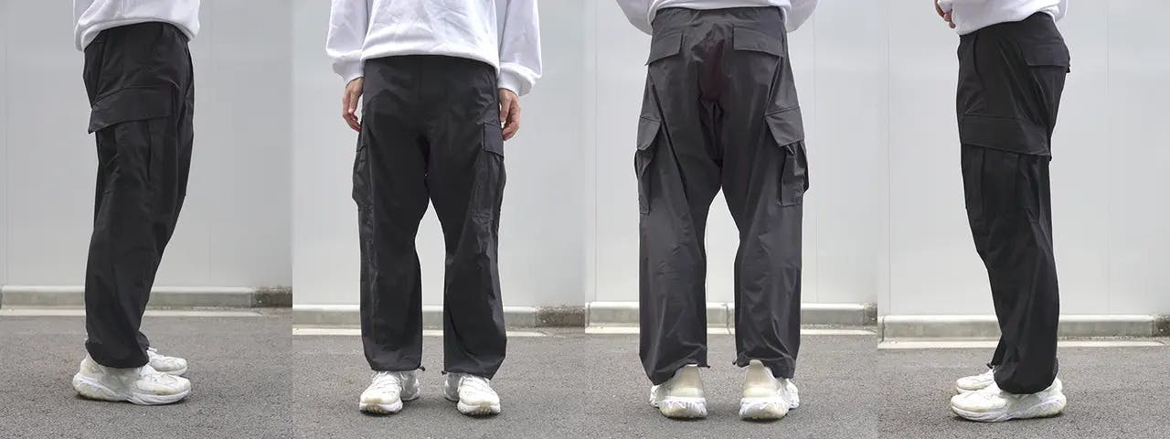 - 手ぶらで出掛けるシーンにおいても、左右前後+左右膝の計6つのポケットがあることから、ちょっとした携帯電話などの荷物もゆったり収納できて、究極の次世代カーゴパンツです。