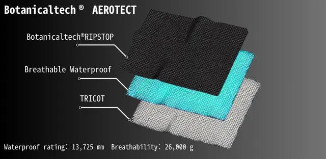 三層構造・第一層:Botanicaltech® ストレッチ RIPSTOP・第二層:透湿防水フィルム AEROTECH・第三層:トリコット