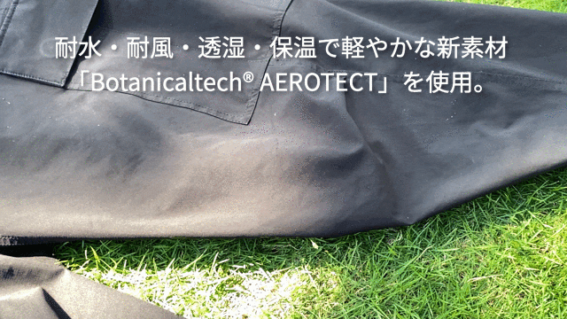 雨や風の侵入を防ぎつつも、服の中に溜まってしまう湿気は逃したいという、日本の梅雨や夏場の台風にも凌げる快適な環境をつくる高機能な素材が、この「Botanicaltech® AEROTECT」という新素材です。 -
