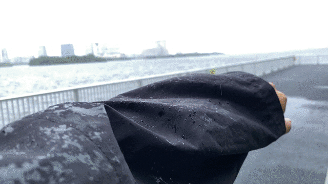 - ちなみに、台風が近づく8月16日に、実際にこの同じ素材を使用した開発中のコートを着て体感して実験したところ、傘を差さずとも雨風の侵入を防いでいました。