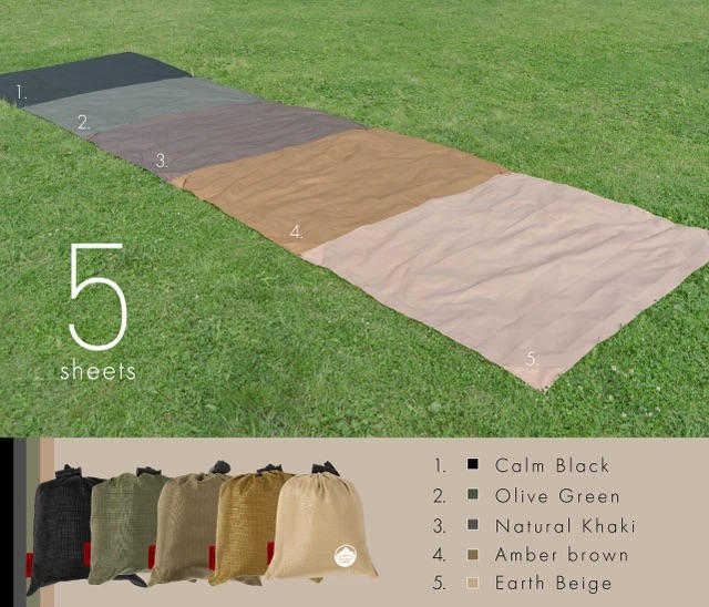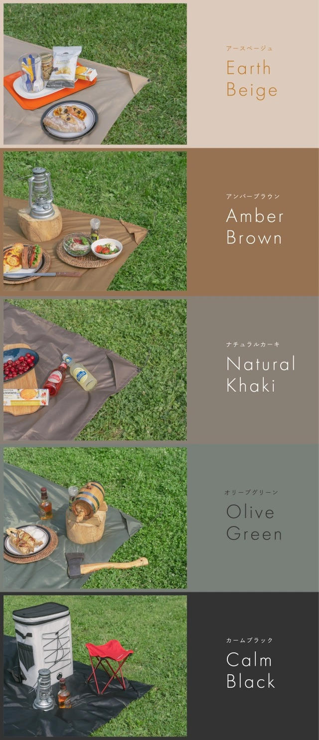- ①オリーブグリーン ②アースベージュ ③アンバーブラウン④ナチュラル カーキ ⑤カームブラック