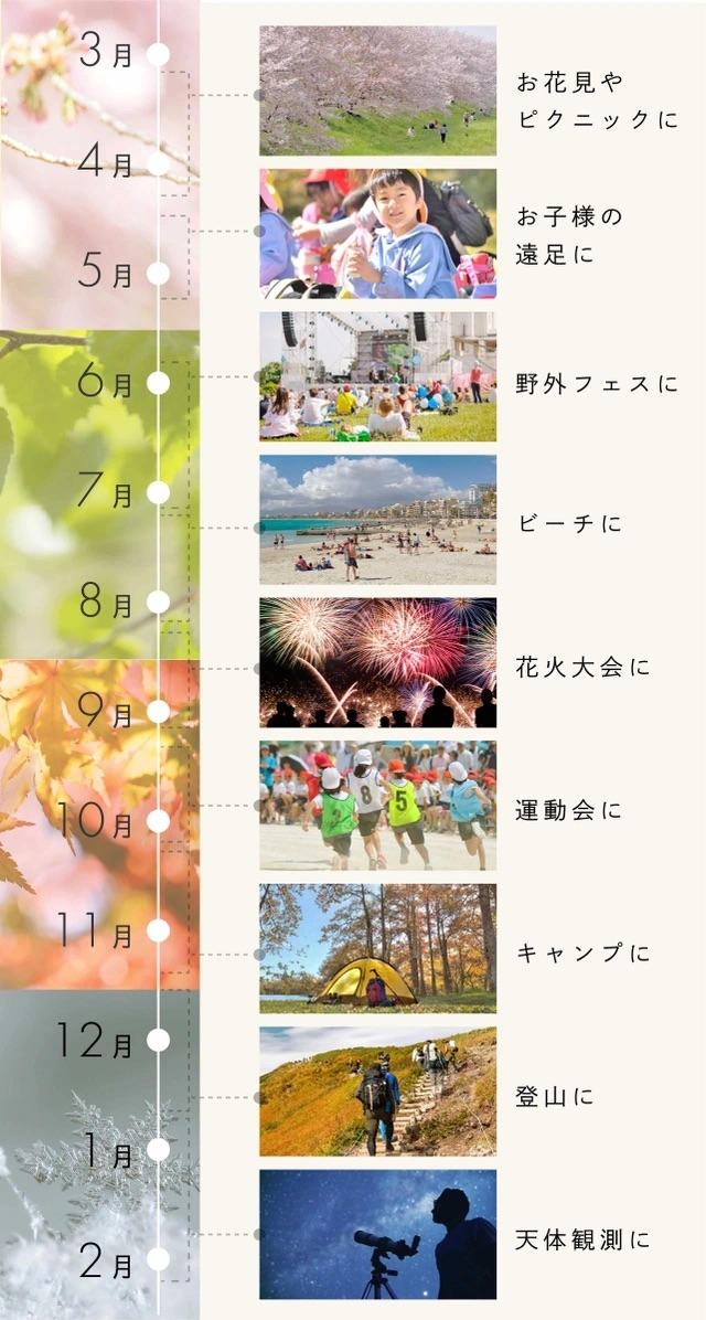 お花見、野外フェス、運動会、ビーチ、登山、スポーツ観戦、遊園地、天体観測、