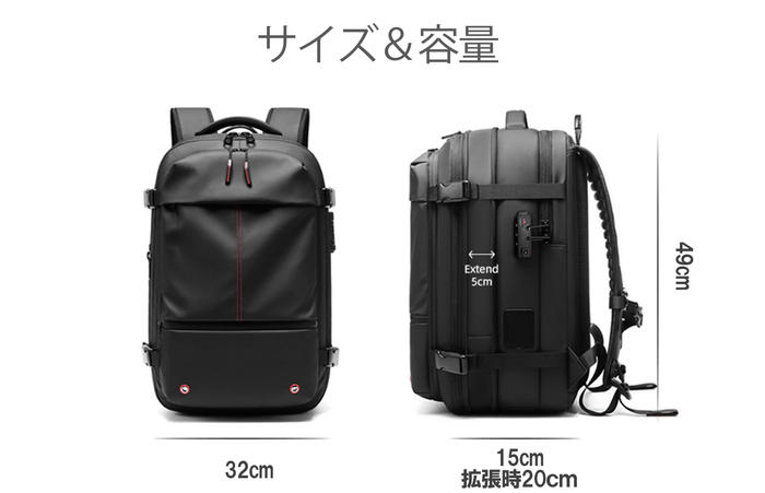 • ポンプ不要の内蔵式真空圧縮システムを搭載し、25Lから最大60Lまで自在に変化するフレキシブル設計。防水仕様で突然の雨にも安心、TSA認証ダイヤルロックで海外出張や旅行も安全に。さらに高耐久SBSジッパーとPC専用収納スペースを備え、通勤から長期の出張まで一つで対応できる頼れる万能ギア。