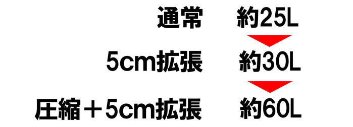 • 通常時はスマートに使える25L、ジッパーを開いて拡張すれば30L、さらに圧縮+拡張機能を組み合わせれば驚きの60Lまで収納可能。日常使いから出張、さらには数日の旅行まで、シーンに応じて自在に容量を切り替えられるフレキシブル設計です。必要なときには大容量、普段はスリムに。
