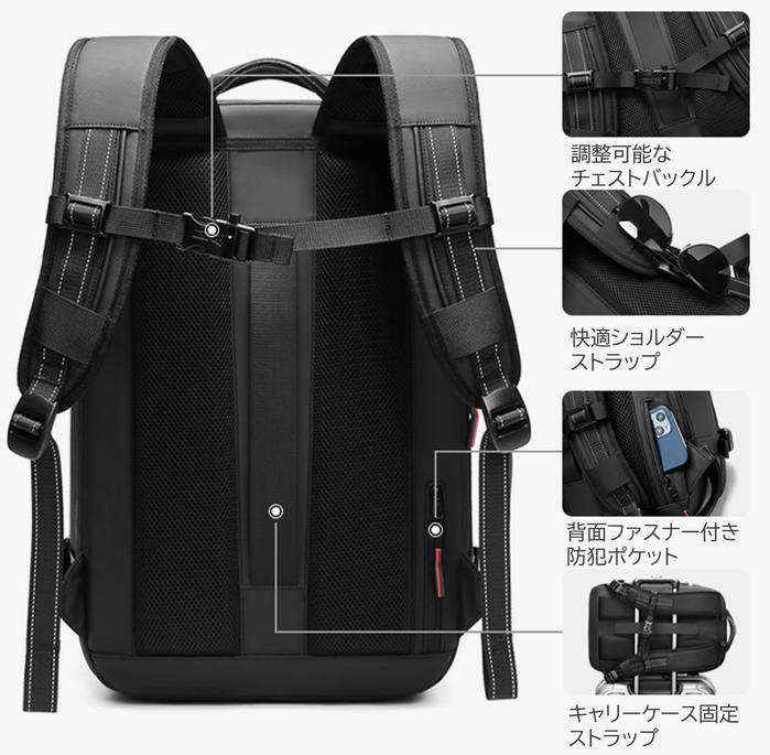 • 人間工学に基づいた設計で、荷重を効率よく分散し、背負ったときの揺れや肩・腰への負担を大幅に軽減。長時間の移動でも疲れにくく、快適な背負い心地を実現します。通勤・出張・旅行など、どんなシーンでも安心して使えるよう細部まで工夫された設計です。