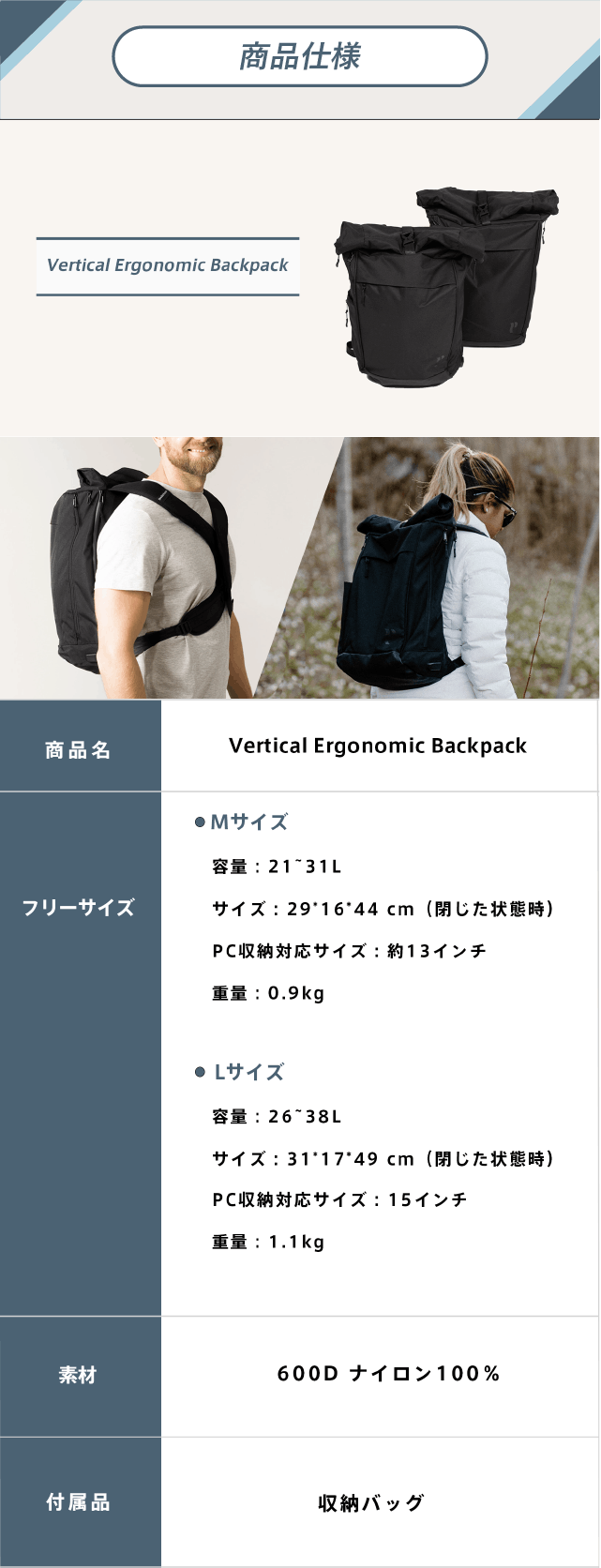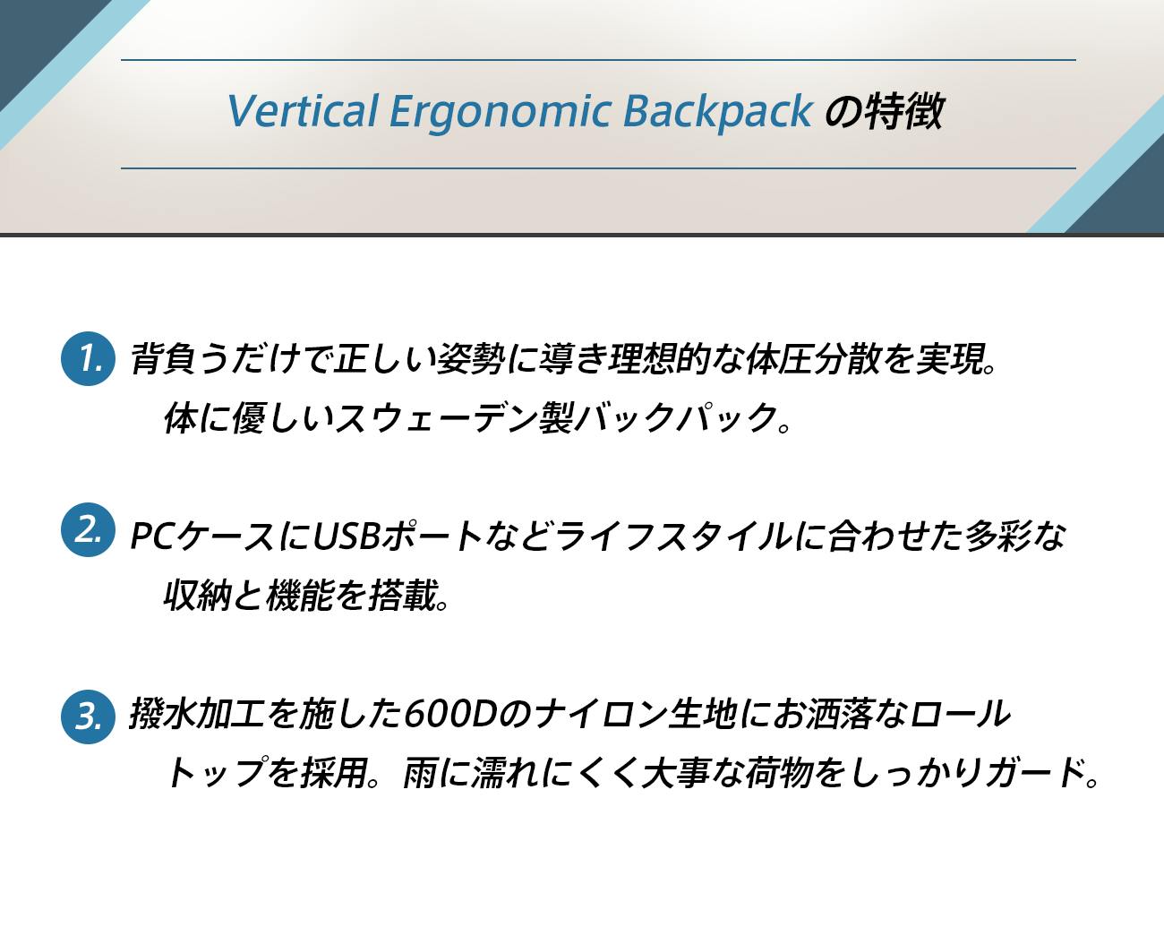 - 【Vertical Ergonomic Backpack】は「体の姿勢をサポートする」を企業理念に作り上げたお洒落で機能的なバックパックです。
