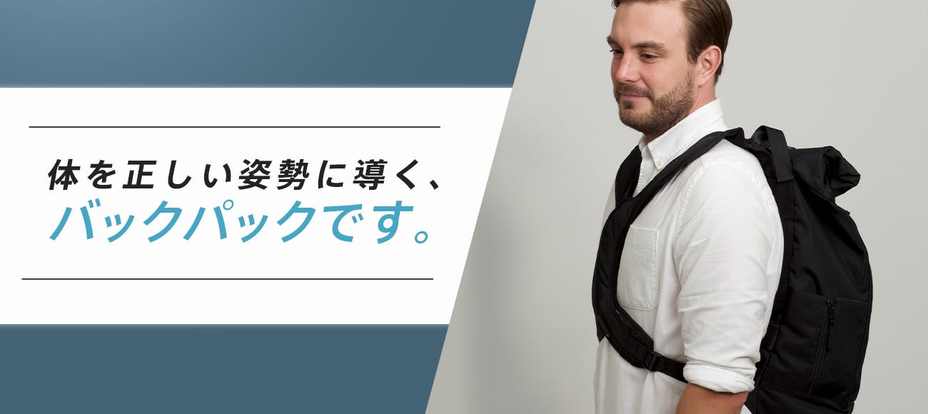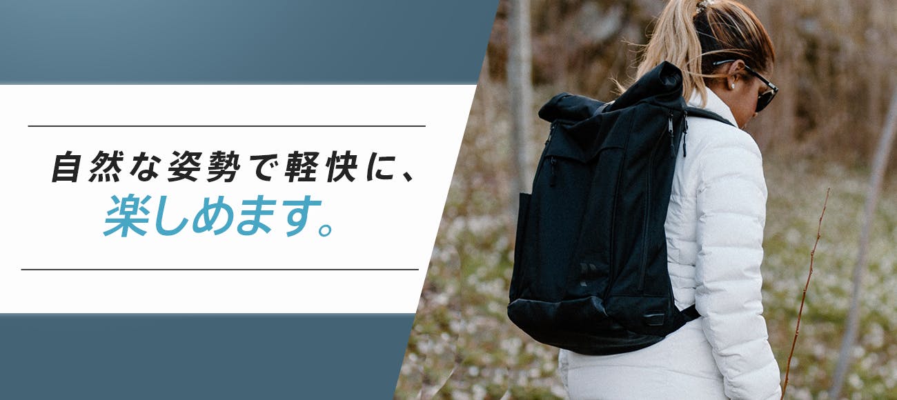バックパックを背負うだけで体を正しい姿勢に導くと共に、体幹で支えることで肩や腰に掛かる体圧を分散し、驚くほど荷物が軽く感じられる優れもの。