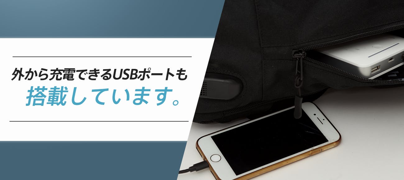 さらに【Vertical Ergonomic Backpack】はバッグパックの中にモバイルバッテリーを入れたまま外から充電できるUSBポートも搭載。
