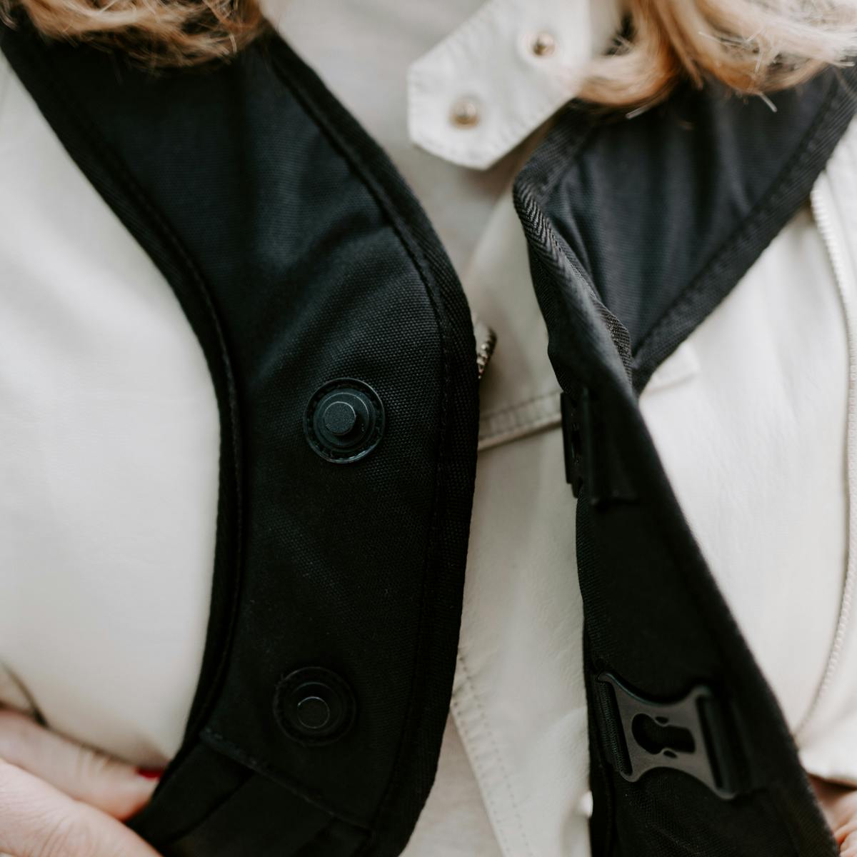 - 2. 左ストラップを右ストラップに被せるようにし、胸の中央で閉じます。
