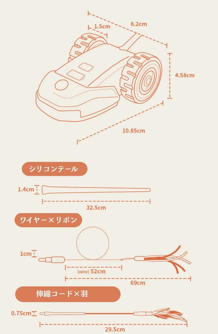 カーペットやタイルなど様々な場所で使用可能ですが、毛足の長いラグでは動作が不安定になることがあります。また、動作中にシリコン製のしっぽやワイヤー、ロープなどが障害物に絡まないよう注意してください。